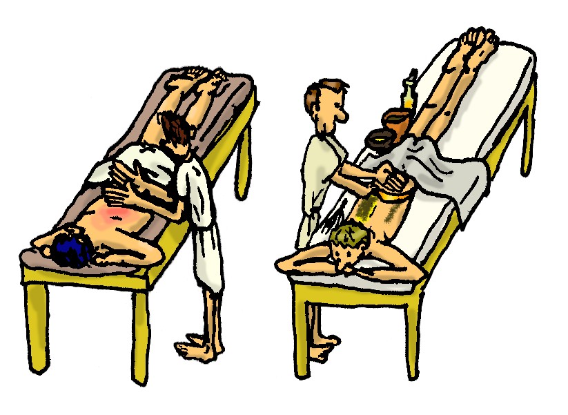 Massage. In sommige badhuizen is het mogelijk om gemasseerd te worden. Soms kost dat best veel geld en is het dus vooral voor rijkere mensen. Met olie en zand word je eerst schoongewreven, waarna de masseur het modderige geheel met een schraapmesje dat strigilus heet van je huid afschraapt. Je wordt dan meteen beetje gladgeschoren op je lichaam, wat verzorgd en dus beschaafd staat. Tot slot mept de masseur je huid roodgloeiend mept zijn handen en met takjes. Daarna ga je dus weer even lekkere in het koude dompelbad.