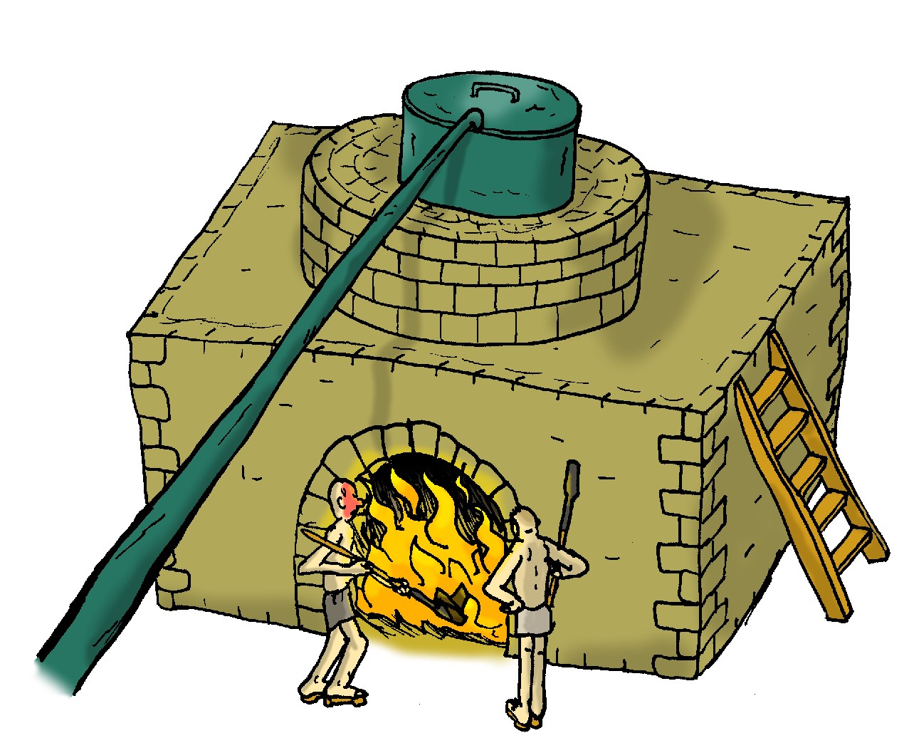 Stookoven. Je zal maar moeten werken in de stookoven van een badhuis! Het is er gloeiend heet van het vuur en dat moet je bovendien de hele tijd aan de gang zien te houden. Het badhuis op deze tekening heeft twee ovens: eentje zit direct onder de sauna. Een nog veel grotere zit aan het einde van het badhuis. Het water stroomt via een loden pijp een grote ketel in en wordt daar gloeiend heet gestookt. Als de ketel vol is stroomt het teveel gewoon naar een andere ketel, zodat het lang genoeg in de stookruimte blijft om heet te zijn. Uiteindelijk komt het water in het hete bad. De hete lucht kan gebruikt worden voor de verwarming van het badhuis.
