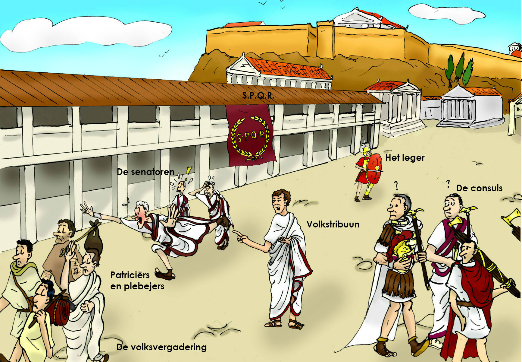 De Volksvergadering. Hierin zitten alle Romeinse staatsburgers, die de belangrijke bestuurders kiezen. Dat is niet zo democratisch als het lijkt, want lang niet iedereen is staatsburger. Naarmate de Romeinen steeds meer land veroveren en er steeds meer staatsburgers komen, wordt het houden van volksvergaderingen natuurlijk ook steeds lastiger. Zo wordt de Volksvergadering zwakker en de Senaat sterker.