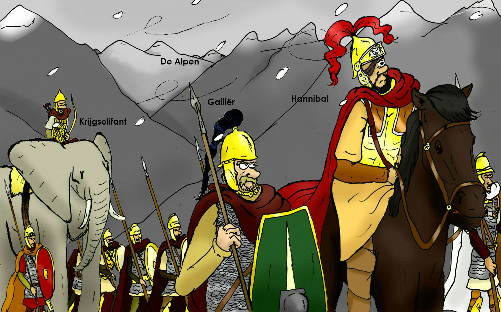 Krijgsolifant. Hannibal neemt olifanten mee als wapen tegen de vijand. Zo’n groot en sterk dier kan immers veel vijandelijke soldaten plat stampen. Gemakkelijk is dat niet, want olifanten zijn eigenwijze dieren die moeilijk te temmen zijn, zodat ze elk hun eigen vaste menner hebben. Als die menner dus sneuvelt is er niks meer aan te vangen met diens olifant. Ook is het klimaat van de bergen waar Hannibal doorheen trekt niet erg goed voor de olifanten.