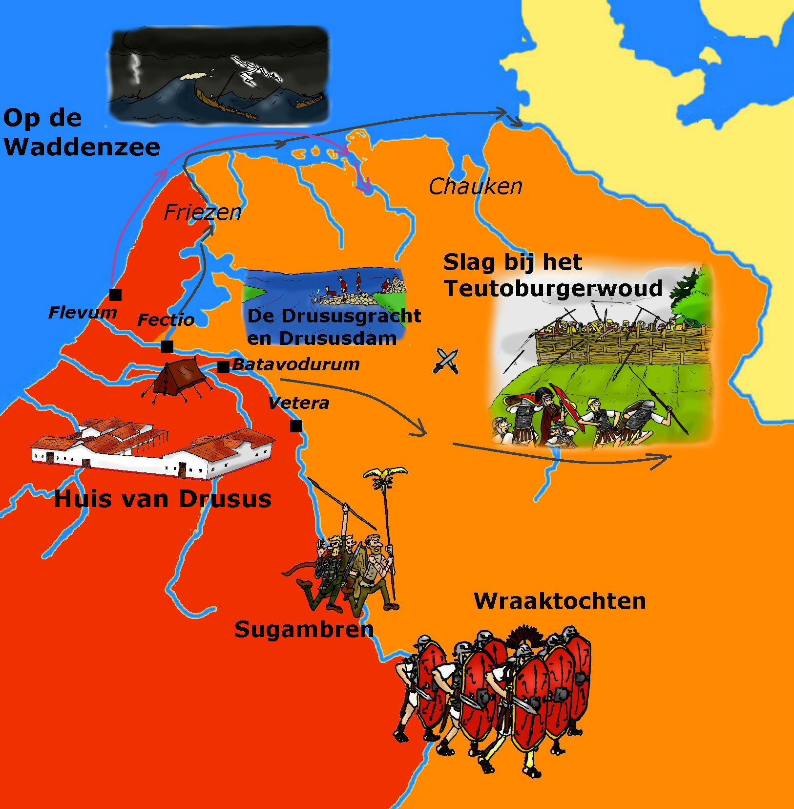 Op de Waddenzee. Als Drusus met zijn schepen het Flevomeer oversteekt ontmoet hij de Friezen, die zich zonder strijd aan hem onderwerpen. Daarna varen de Romeinen de Waddenzee op om zo naar de Eems te komen. Op de terugtocht in de herfst breekt er storm uit, terwijl de Romeinen ook moeten wennen aan eb en vloed en de zandbanken in de Waddenzee. Met Friese hulp keert Drusus veilig terug. De Romeinen ondernemen daarna vaker verkenningstochten met de vloot. Eén keer varen ze zelfs om Denemarken heen! Maar in 16 na Chr. heeft de vloot minder geluk. Bij de terugtocht breekt weer storm uit en sommige schepen worden vernield of op het droge geworpen. Sommige soldaten zitten wekenlang vast op kleine eilandjes en overleven door paarden op te eten!